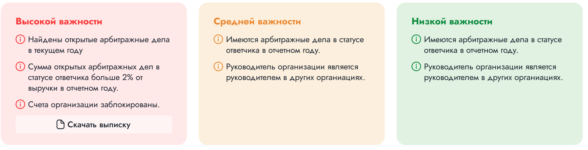 - Высокой важности - данные организации, которые имеют высокий показатель риска. Стоит использовать дополнительные меры безопасности при работе с контрагентом